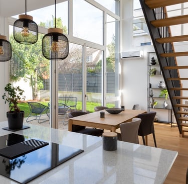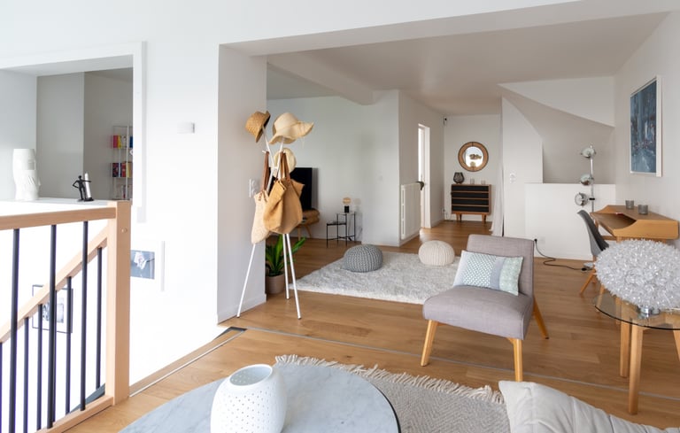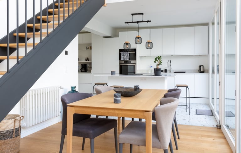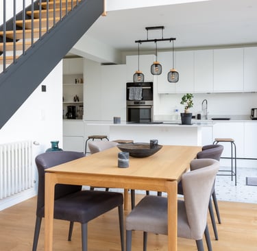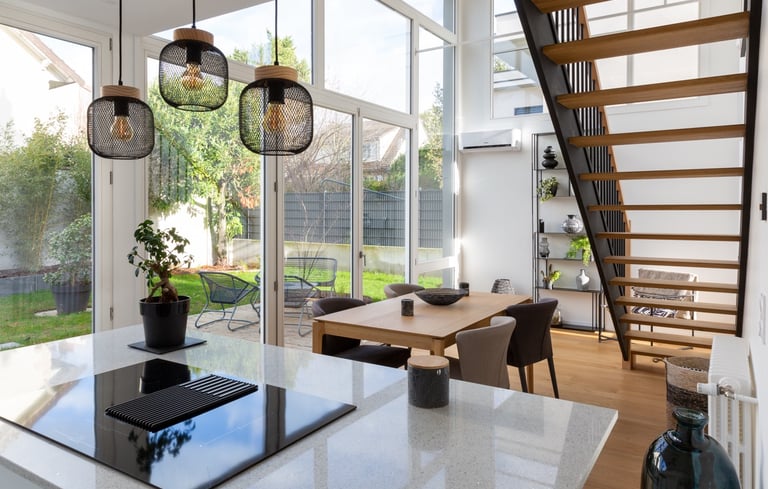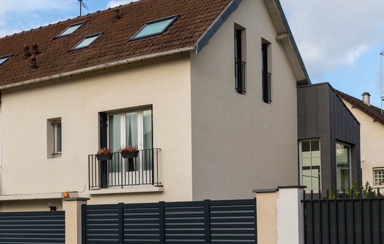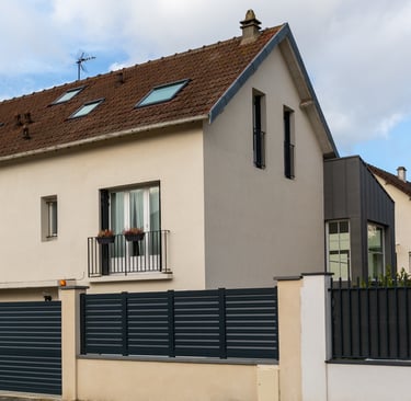 Le projet réinvente une maison des années 40 de 160 m2, par une recomposition sensible des volumes avec une extension en zinc, entièrement vitrée, qui s’ouvre généreusement sur le jardin. Les circulations se clarifient, les rangements se fondent sur mesure, et l’enveloppe atteint un haut niveau de performance, portée par des équipements de dernière génération — pompe à chaleur, ballon thermodynamique, plancher chauffant, climatisation. Les réseaux, repris intégralement, assurent pérennité et sécurité. L'extérieur est repensé — ravalement, terrassement et plantations — pour renouer le dialogue entre intérieur et extérieur. L’ensemble affirme une contemporanéité et une élégance.
