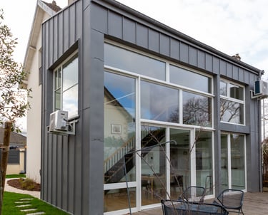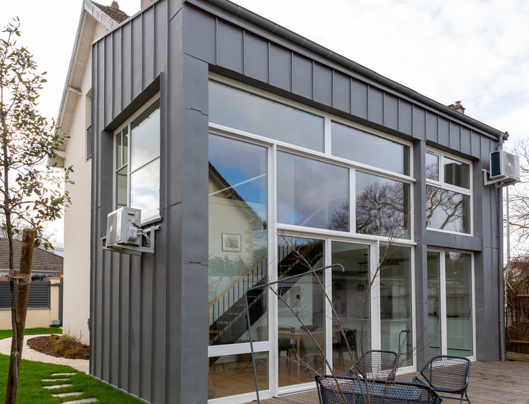 Le projet réinvente une maison des années 40 par une recomposition sensible des volumes avec une extension en zinc, entièrement vitrée, qui s’ouvre généreusement sur le jardin. Les circulations se clarifient, les rangements se fondent sur mesure, et l’enveloppe atteint un haut niveau de performance, portée par des équipements de dernière génération — pompe à chaleur, ballon thermodynamique, plancher chauffant, climatisation. Les réseaux, repris intégralement, assurent pérennité et sécurité. L'extérieur est repensé — ravalement, terrassement et plantations — pour renouer le dialogue entre intérieur et extérieur. L’ensemble affirme une contemporanéité et une élégance.